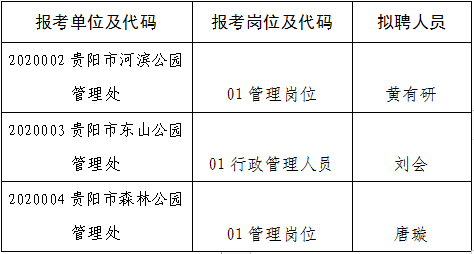 貴陽市綜合行政執(zhí)法局2020年公開招聘局屬事業(yè)單位工作人員已通過筆試、專業(yè)測(cè)試、面試、體檢、考核階段。經(jīng)審核,以下人員符合聘用條件,現(xiàn)予以公示:
