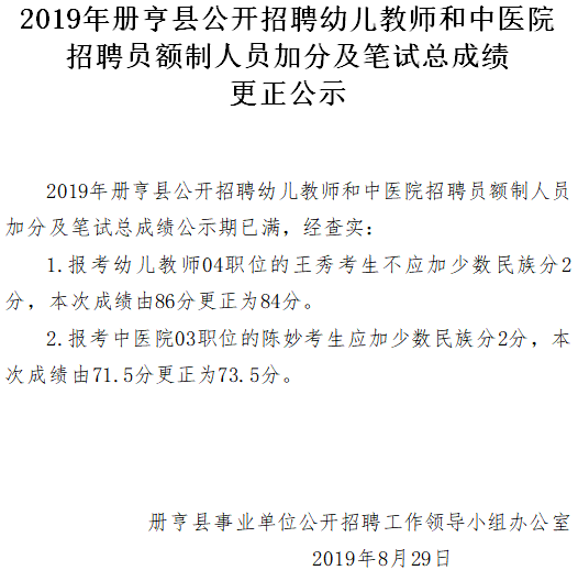 2019年冊亨縣公開招聘幼兒教師和中醫(yī)院招聘員額制人員加分及筆試總成績更正公示
