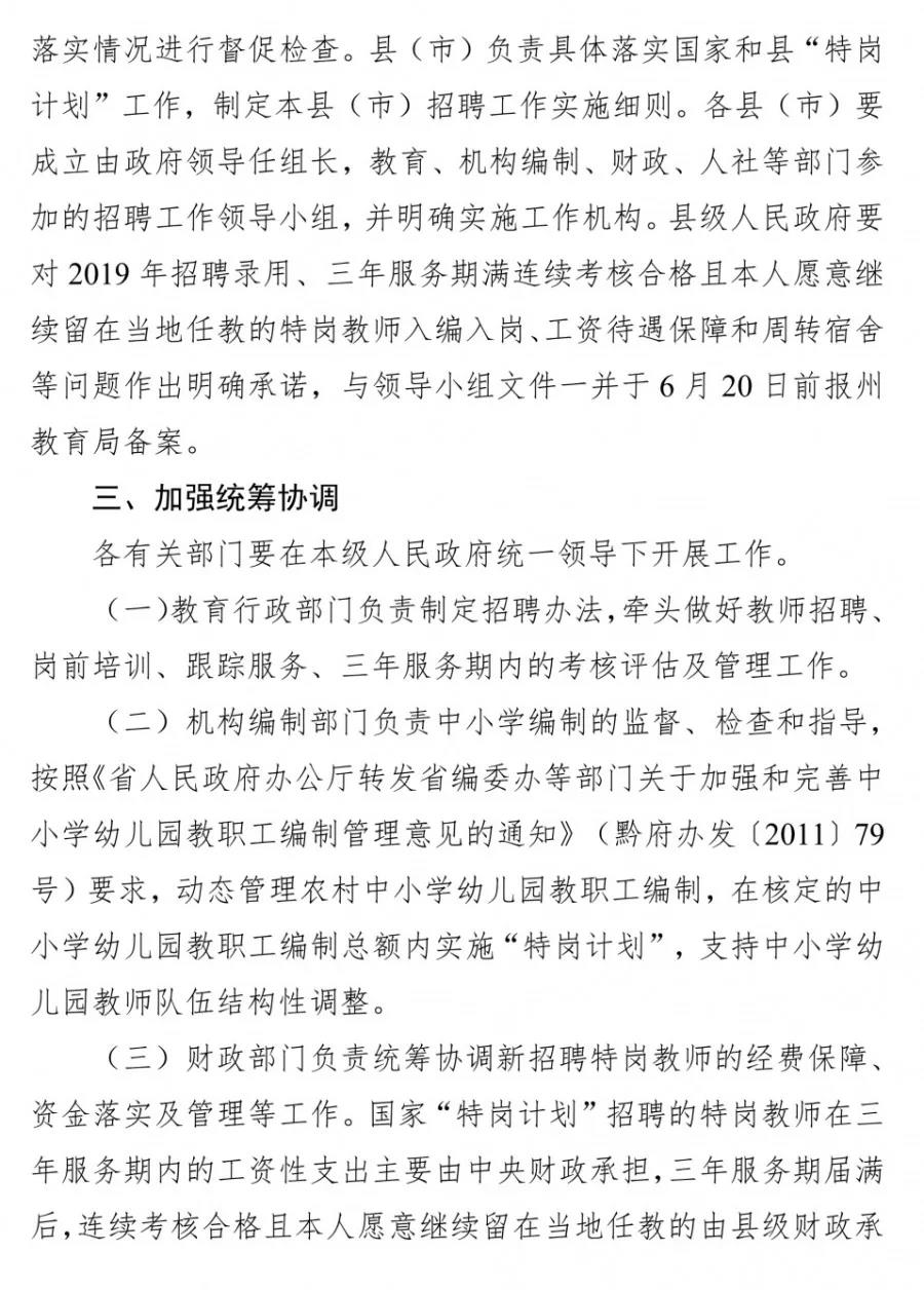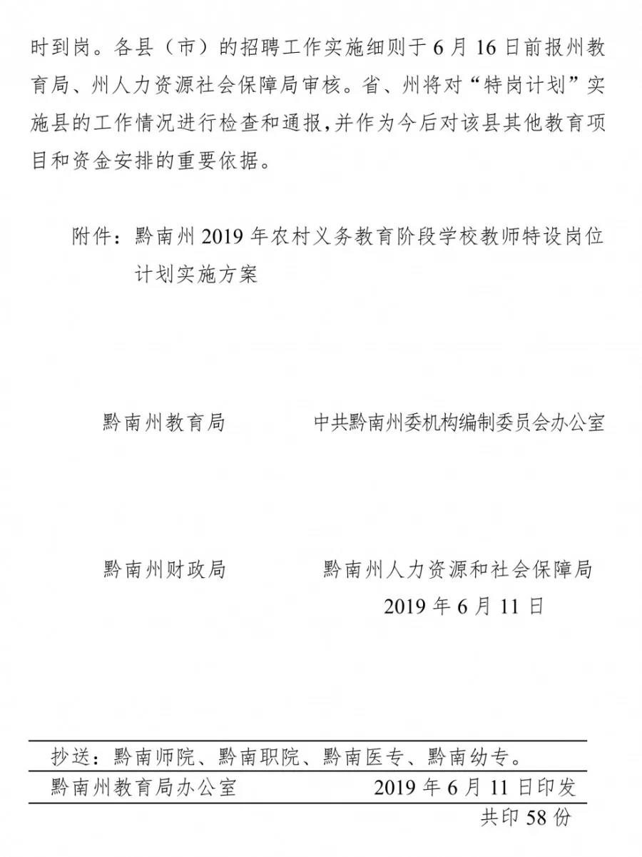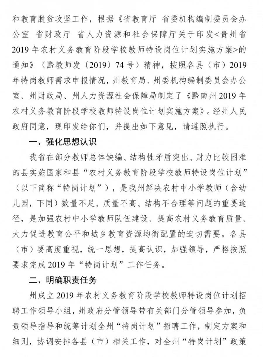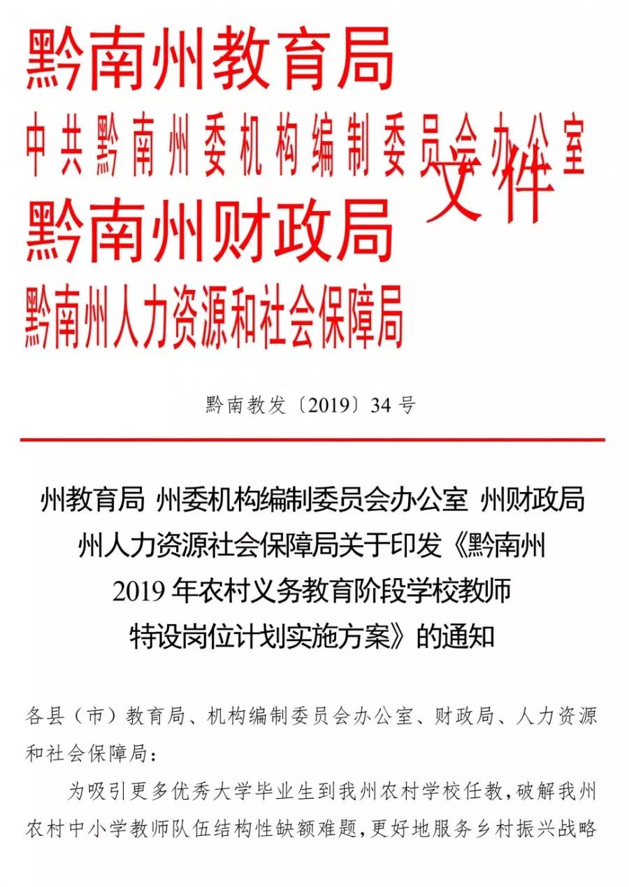 為進一步加強我州農(nóng)村教師隊伍建設,充實農(nóng)村學校師資力量,提升農(nóng)村教育質量,根據(jù)《省教育廳省委機構編制委員會辦公室省財政廳省人力資源和社會保障廳關于印發(fā)<貴州省2019年農(nóng)村義務教育階段學校教師特設崗位計劃實施方案>的通知》(黔教師發(fā)〔2019〕74號)精神,結合我州實際,制定本方案。