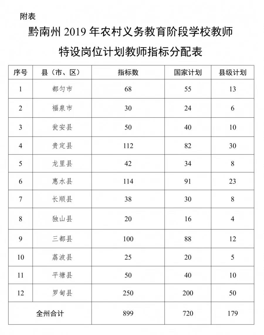 (二)2019年,全州安排“特崗計劃”指標899名。其中國家“特崗計劃”720名,縣“特崗計劃”179名(具體指標分配詳見附表)。