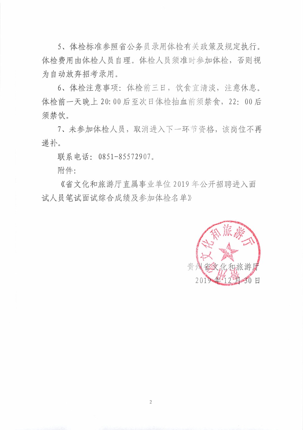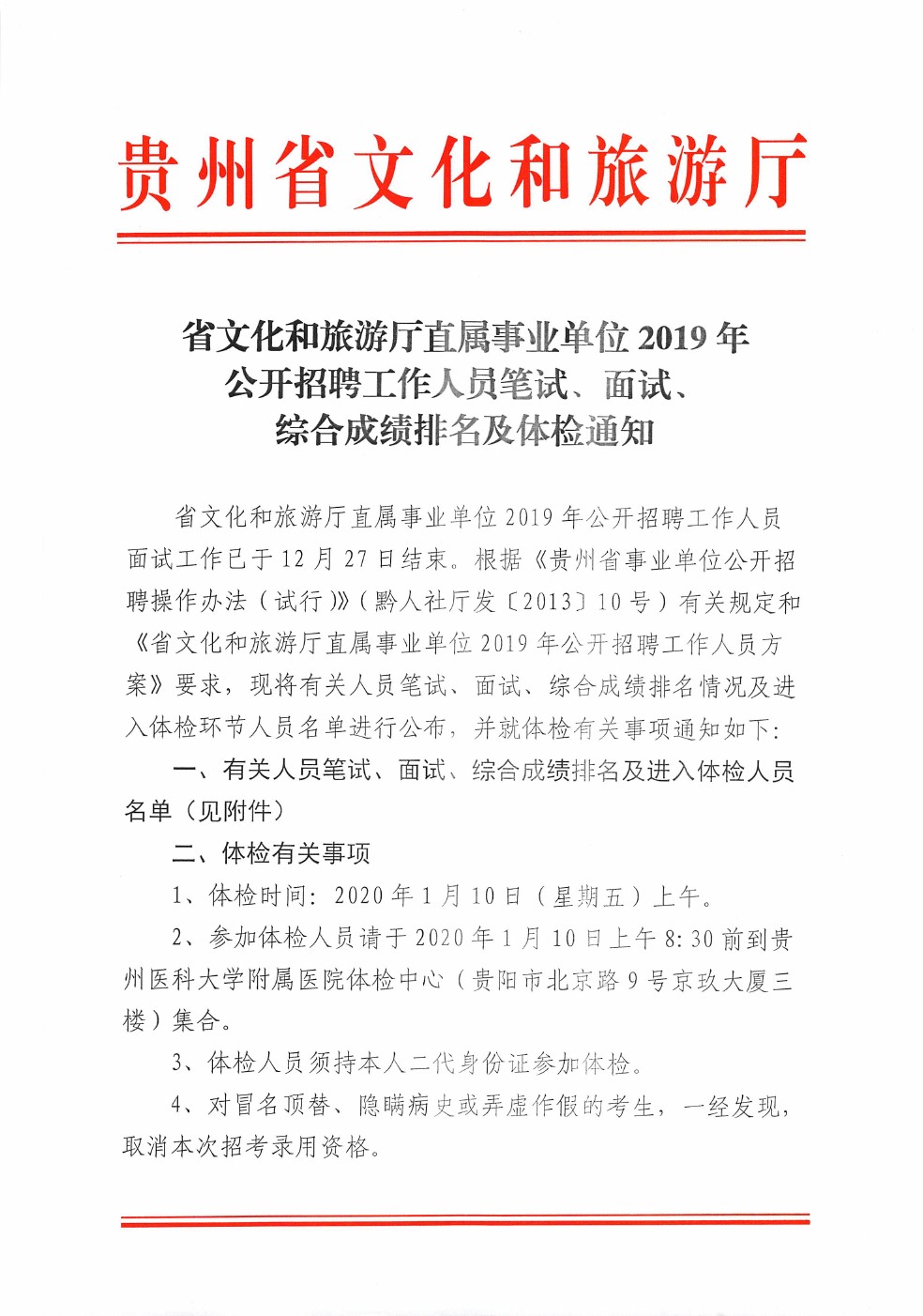 省文化和旅游廳直屬事業(yè)單位2019年公開招聘工作人員面試工作已于12月27日結(jié)束。根據(jù)《貴州省事業(yè)單位公開招聘操作辦法(試行)》(黔人社廳發(fā)〔2013〕10號)有關(guān)規(guī)定和《省文化和旅游廳直屬事業(yè)單位2019年公開招聘工作人員方案》要求,現(xiàn)將有關(guān)人員筆試、面試、綜合成績排名情況及進(jìn)入體檢環(huán)節(jié)人員名單進(jìn)行公布,并就體檢有關(guān)事項(xiàng)通知如下: