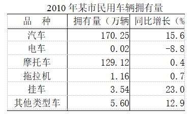 2010 年末,某市民用車輛擁有量達 309.7 萬輛,同比增長 8.7%,其中,進口車擁有量 12.54 萬輛,增長 43.2%。