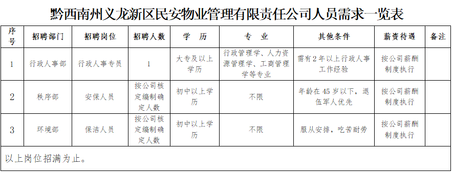 1、黔西南州義龍新區(qū)民安物業(yè)管理有限責(zé)任公司人員招聘一覽表;