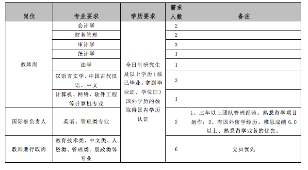 招聘崗位及人數(shù):根據(jù)工作需要,我校擬面向社會公開招聘教師及工作人員共計21名,崗位要求如下: