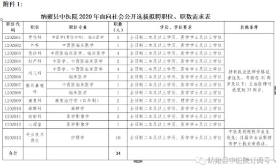選拔全日制二本及以上學(xué)歷畢業(yè)生34人。具體詳見附件1《納雍縣中醫(yī)院2020年面向社會(huì)公開選拔擬聘職位、職數(shù)需求表》。